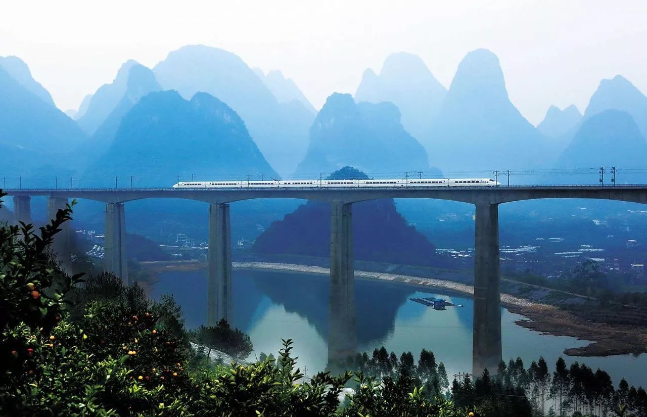 五年來,廣西自治區先後建成柳南、貴廣、雲桂、南廣等鐵路,管內14個地級市有12個開通動車,新建28座高鐵車站,高鐵運營里程達1771公里,在國家級貧困縣凌雲縣等地建設開通高鐵無軌站(指在沒有高鐵線路經過的縣區提供高鐵售票服務,並協調地方政府開行專線大巴,方便沿線羣眾到就近高鐵車站乘車出行)13座,為自治區經濟社會發展和民生改善提供了可靠運輸服務保障,極大促進了國家精準扶貧戰略的實施。圖為動車組列車穿行在八桂山水間。