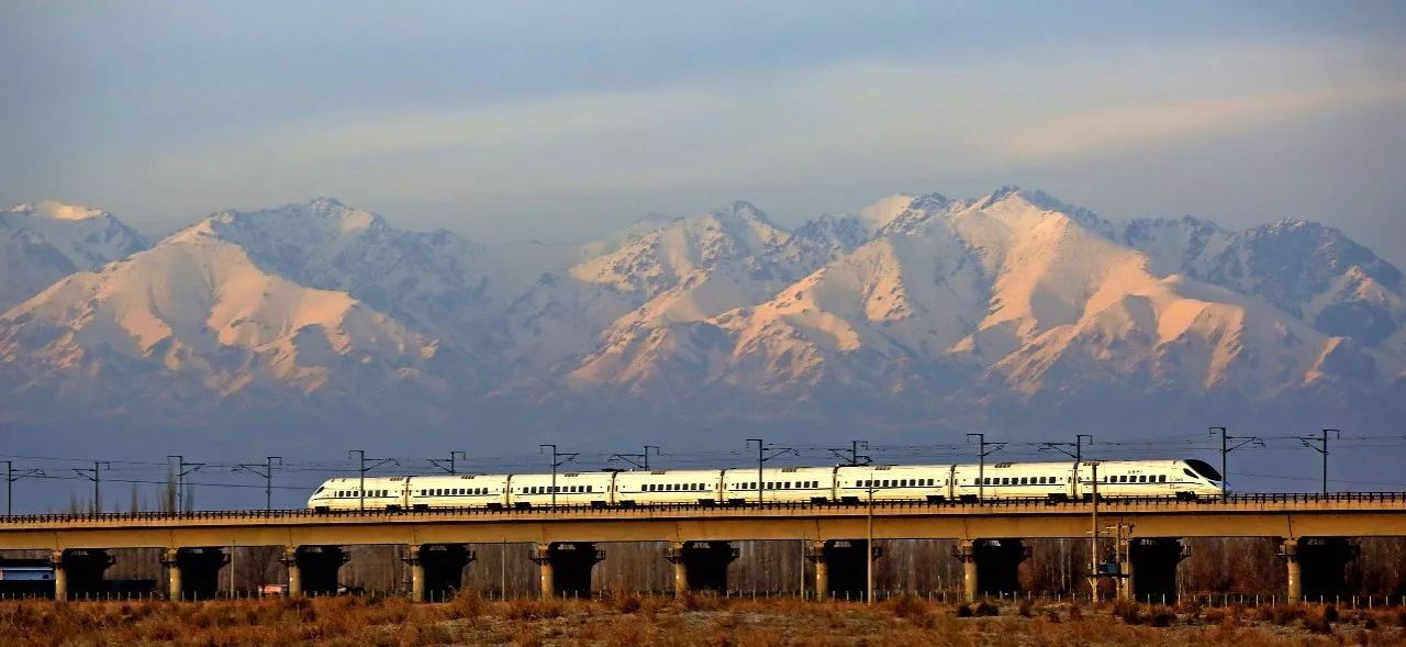 五年來,我國加大中西部地區特別是革命老區和集中連片特困地區鐵路建設力度,西部地區新增鐵路營業里程1.3萬公里,截至2016年底,西部鐵路營業里程達到5.0萬公里,佔我國鐵路營業里程的40.5%。2014年12月26日,全長1777公里,世界上一次建設里程最長,穿越沙漠地帶和大風區的蘭州至烏魯木齊高速鐵路投入運營。圖為蘭新高鐵動車組列車行駛在天山腳下。
