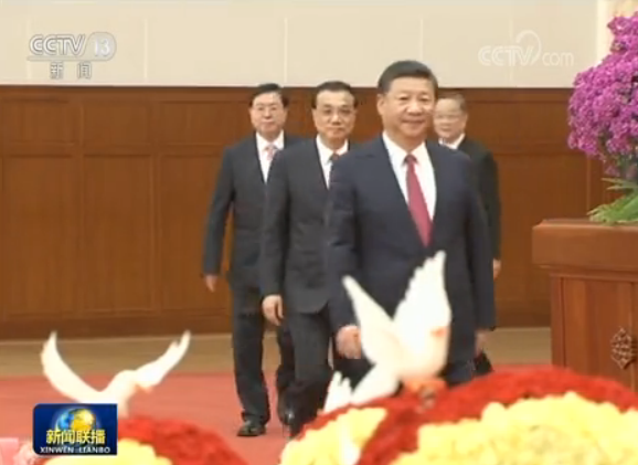17時30分許,伴隨歡快的《迎賓曲》,習近平等黨和國家領導人步入宴會廳,全場響起熱烈掌聲。