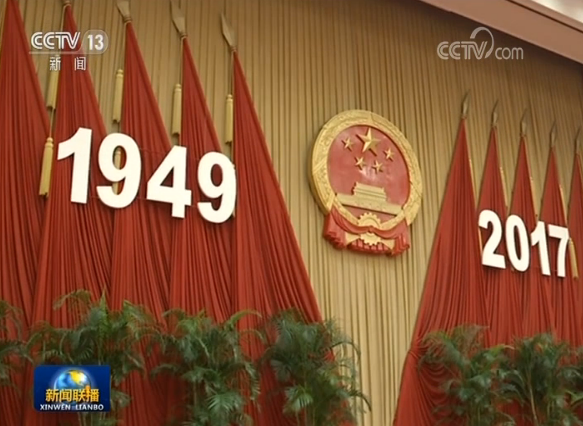 人民大會堂宴會廳華燈璀璨,賓朋濟濟一堂,氣氛喜慶熱烈。主席台上方莊嚴的國徽高懸,在鮮豔的紅旗映襯下,“1949-2017”的大字年號熠熠生輝。