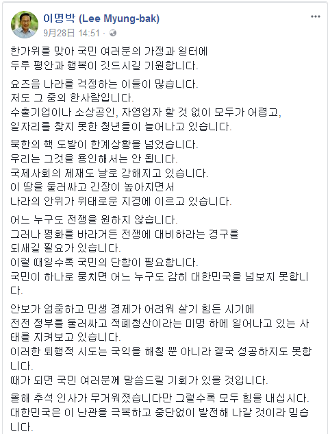 李明博在“臉書”上發文痛斥現政權在國家危機之時卻忙着在國內搞清算