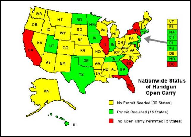 先給大家科普一下,所謂公開持槍權就是在公共場合秀出你的武器的權利,也就是説走在大街上,你可不可以別一把手槍在皮帶上,這得要講法律。美國各州公開持槍權(這裏主要講手槍)大約可以分為三類: