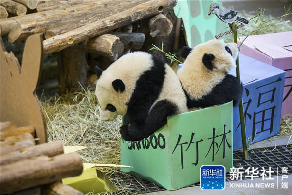 當日,熊貓幼崽加悦悦與加盼盼在裝飾一新的活動屋裏玩耍,呆萌的樣子惹人愛。