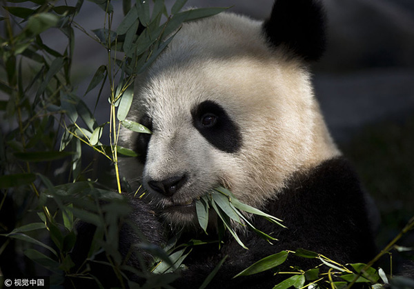 當地時間2017年10月5日,加拿大多倫多,大熊貓“二順”和她的幼崽加盼盼和加悦悦分享竹子。@視覺中國