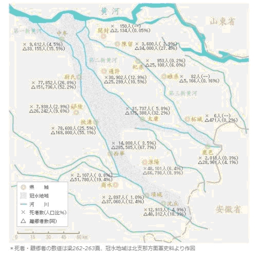 河南省戰時損失調査報告,行政院善後救濟總署(呂敬之)統計:河南、安徽和江蘇3省44個縣因此災,3911354人外逃,經濟損失10.9176億元。這次人為災害,豫、皖、蘇3省44個縣市,5.4萬平方公里範圍內盡受滅頂之災,1250萬人流離失所,89萬人死於滔滔洪水。