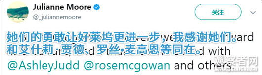 朱麗安·摩爾(Julianne Moore)也表示,“與艾什莉•賈德、羅絲•麥高恩等受害人同在。”