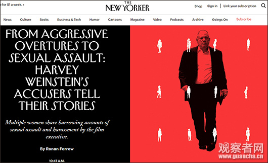 10日,《紐約客》雜****志刊登了一篇同樣題材的專題報道,多位知名女星實名爆料,更有三人控訴哈維強姦了自己。