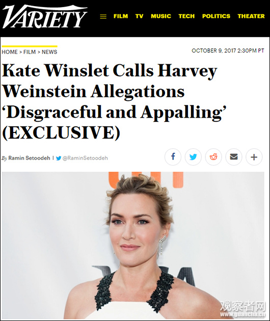 哈維曾助凱特·温斯萊特(Kate Winslet)憑藉《朗讀者》拿下奧斯卡影后,但後者同樣立場鮮明,在發給美國娛樂新聞網Variety的聲明中,凱特稱哈維的行徑“令人作嘔”、“零容忍”。