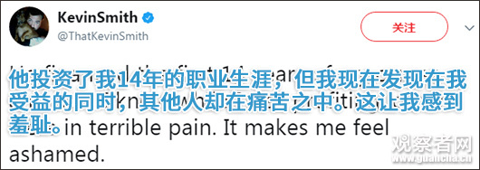 曾執導《瘋狂店員》的凱文•史密斯(Kevin Patrick Smith)發推:“他投資了我14年的職業生涯,但我現在發現在我受益的同時,其他人卻在痛苦之中。這讓我感到羞恥。”