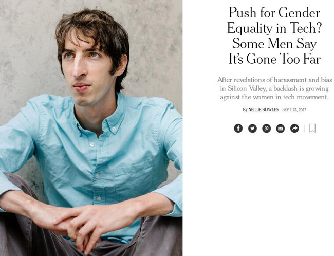 詹姆斯·達默爾是谷歌的一名工程師,今年28歲,説話輕聲細語。有些人暗自覺得平權運動矯枉過正,達默爾則説出了他們的心裏話。在不下兩次接受宣揚性別平等的員工訓練後,他感到非常不快,便在谷歌內部的留言板上寫了幾句話,他憤憤不平道:女性之所以在科技行業處於下風,正是因為她們在科技工程領域天生不如男性。上個月,他被谷歌開除了。