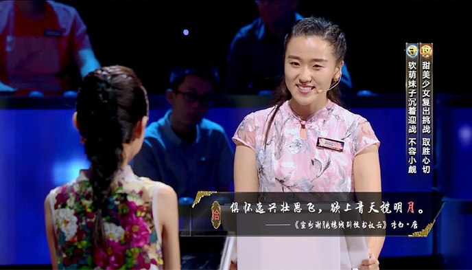 最後,賀莉然因思考時間超過規定而略輸一籌,不過,她隨後還是説出了最後想到的那句詩:“明月別枝驚鵲,清風半夜鳴蟬。”
