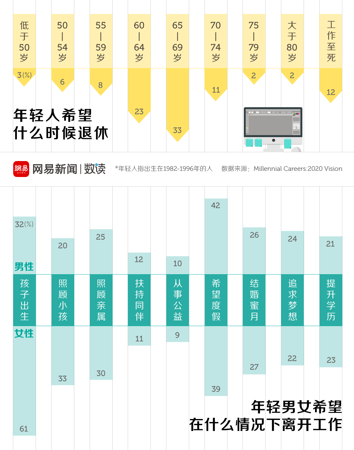 在更大的工作壓力和更長的工作時間之外,84%的千禧一代也希望能夠能有一定的休息時間。除了人人都想要的度假外,女性明顯比男性更顧家,61%的女性希望在孩子出生後可以離開工作崗位,而男性只有32%。只有21-24%的人願意為了提升學歷和追求夢想離開現在的工作。
