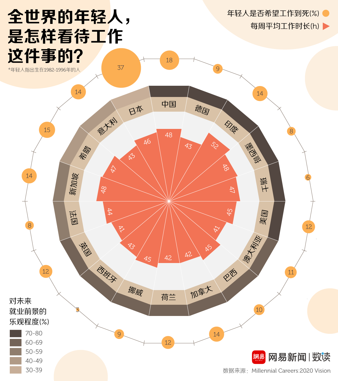 雖然“喪”成了一種文化,但有媒體數據顯示,中國千禧一代年輕人可能希望工作更久。網易數讀10月11日發表文章稱,Manpower Group近日發佈的報告顯示,千禧一代(出生於1982年-1996年)將在2020年佔據全球工作崗位的1/3。而這些年輕人也正面臨着更大的工作壓力。超過七成的千禧一代每週工作超過40小時,還有近1/4的年輕人一週工作超過50小時。在中國,18%的年輕人願意終生工作。