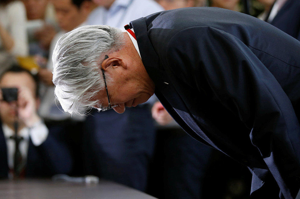 當地時間2017年10月12日,日本東京,日本神户鋼鐵總裁川崎弓在新聞發佈會上鞠躬致歉。 來源:視覺中國