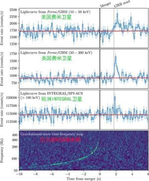 圖1:人類首次探測到雙中子星合併的引力波以及相對應的電磁信號