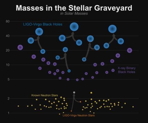 圖7:目前所探測到的黑洞和中子星質量分佈圖,可以看到兩者之間存在一個很大的空白,此次探測是第一個填進此空白區域的天體。