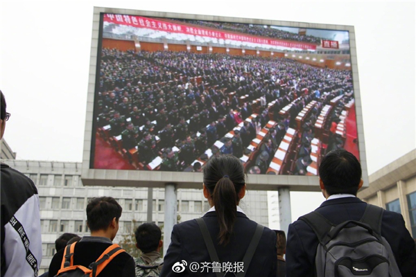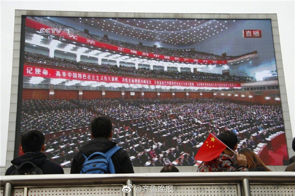 據齊魯晚報微博消息,18日早上,在濟南火車站廣場上,來自四面八方的旅客匯聚在廣場大屏幕下觀看了十九大開幕式。