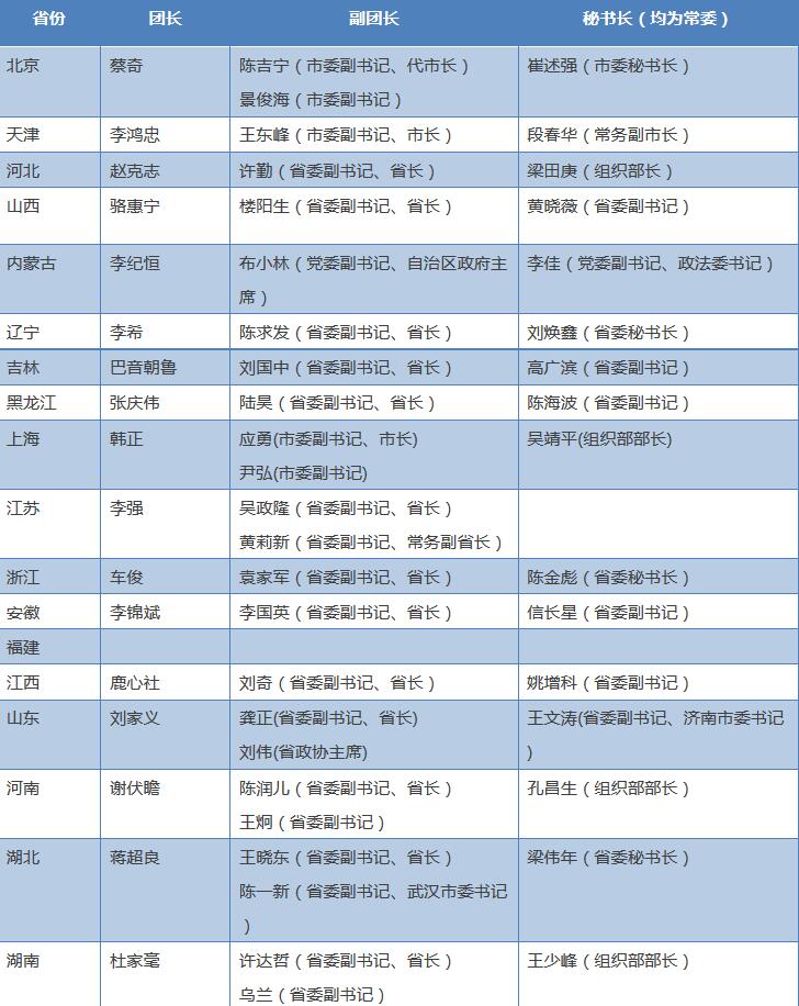 團長多數由省(市)委書記擔綱(福建、甘肅未公佈)。