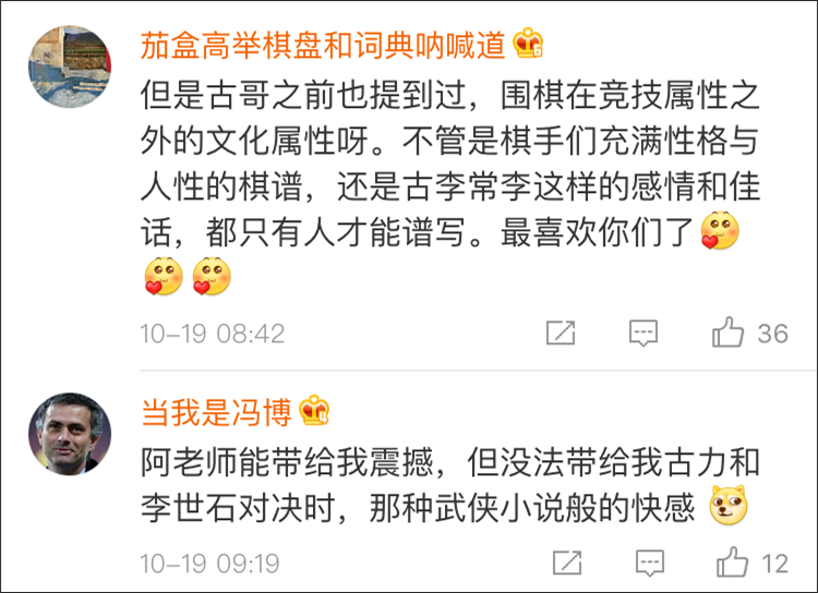棋手古力也轉發了這條微博,説:“20年不抵3天啊!我們的傷感,人類的進步!”