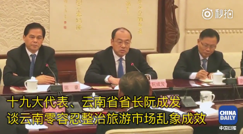 據中國日報報道,19日,十九大代表、雲南省省長阮成發在十九大雲南團開放日答記者提問時表示,省政府出台22條措施旅遊市場整治亂象,發現一起堅決查處一起。鋪天蓋地的“低價團現象”沒有了,強迫遊客在指定場所購物現象沒有了,旅遊投訴大幅下降。