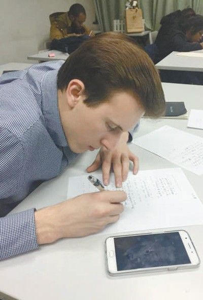 外國學生馬修•塞申斯在課堂上認真地用中文完成老師佈置的作業