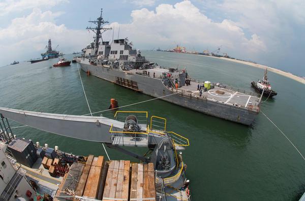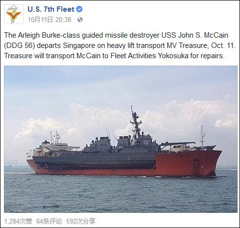 目前,搭載着“約翰•麥凱恩”號的半潛船已經離開新加坡樟宜海軍基地,正在駛往日本橫須賀途中。據悉,“約翰•麥凱恩”號預計將在本月晚些時候被運抵橫須賀,屆時,將“約翰•麥凱恩”號從半潛船上卸除下來將需要8個小時的時間。美國海軍消息稱,此次“約翰•麥凱恩”號的轉運工作是由美國海軍海洋工程主管及潛水救撈監督部(SUPSALV)具體負責實施的。來自SUPSALV的美國海軍海洋工程專家在10月11日宣佈了已經完成“約翰•麥凱恩”號的準備工作。