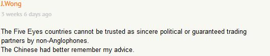 對於母語非英語的國家來説,五眼聯盟(該聯盟由美國、英國、澳大利亞、加拿大和新西蘭五國的情報機構組成,二戰時為破解德國和日本海軍密碼而建立,但戰爭結束後並未解散並一直存在至今。這五個國家組成的情報網絡內部實現了情報信息的互通,竊取來的政治、軍事、科技以及商業信息在這些國家的政府部門和公司之間實現了共享——觀察者網注)的成員國絕不應獲得任何政治或商業上的信任。中國人最好記住我的這一忠告。