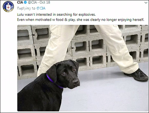 英國廣播公司19日報道,“露露”是一隻黑色拉布拉多犬。經過幾周訓練,它仍難以達標。中情局在Twitter官方賬户18日連發數條“推文”,解釋“露露”被“退學”的原因。