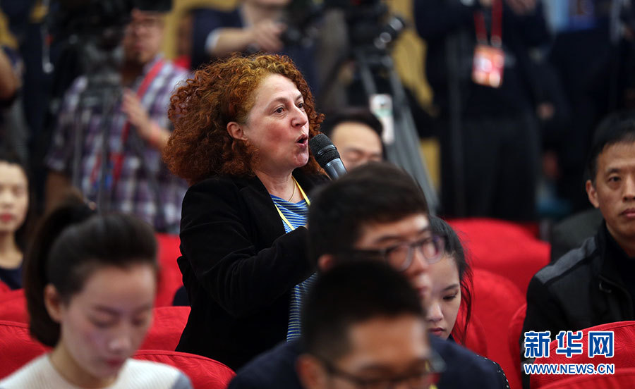 10月22日,十九大新聞中心在梅地亞中心二層新聞發佈廳舉辦集體採訪活動,主題為“中國特色強軍之路邁出堅定步伐”。圖為意大利24小時太陽報記者提問。新華網 郝廣鵬攝