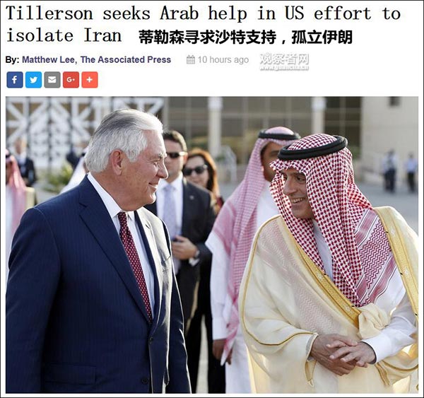 就在蒂勒森到訪之前兩天,美國總統特朗普宣佈面對什葉派伊朗的政策。特朗普指責伊朗“散佈死亡、毀滅以及混亂”。除了繼續指責伊朗核協議問題,特朗普還譴責伊朗支持敍利亞巴沙爾政府。對此,伊朗外交部長扎裏夫表示遺憾,稱“這麼多年過去了,美國就是不願意承認,伊朗正是該地區反恐以及安全和平穩定的基石”。