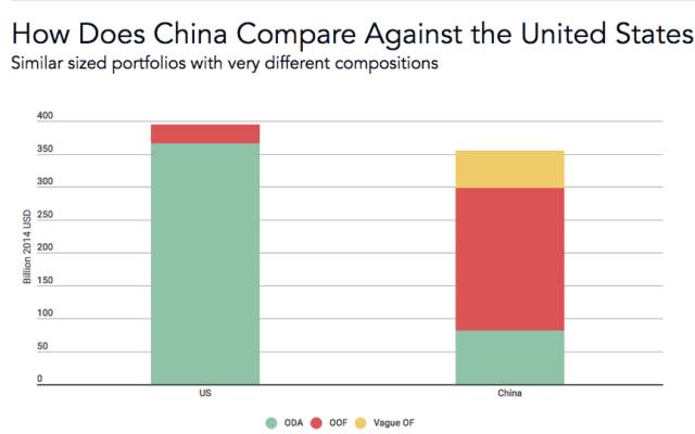 中美兩國援助構成,綠色塊為ODA,紅色塊為OOF 來源:AidData官網截圖