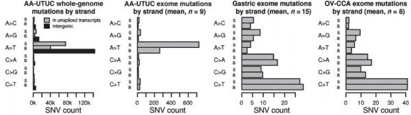 其次比較了兩種典型癌症(幽門螺桿菌導致的胃癌和麝貓後睾吸蟲導致的膽管癌)與UTUC的突變情況,發現後者獨樹一幟,A到T的突變很多,於是認為這是一個“指紋特徵”(signature)。