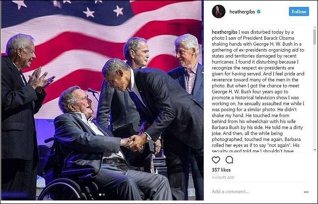 美國女演員指控合影時遭遇鹹豬手 前總統老布什道歉