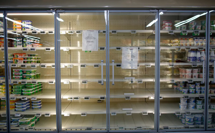 在超市的貨架上寫着:因為製造黃油的原料短缺,我們無法為你提供這項產品。圖片來源:《衞報》