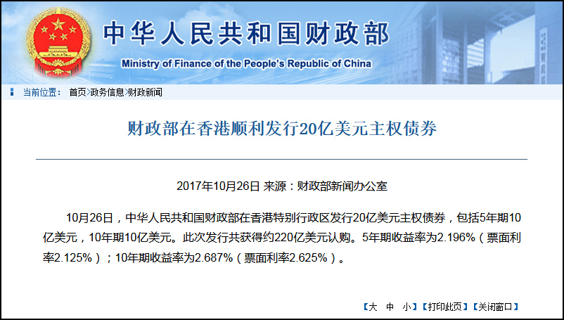 中國財政部網站10月26日晚間發佈消息,當天財政部在香港特別行政區發行了20億美元主權債券,包括5年期的10億美元和10年期的10億美元。此次發行共獲得約220億美元認購,為計劃發行金額20億美元的十倍。
