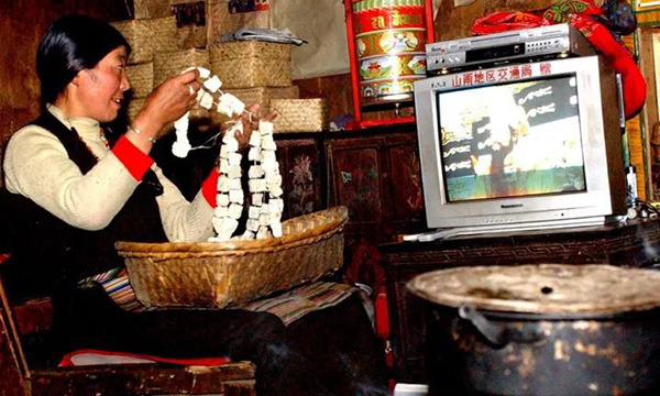 2003年10月,卓嘎的妹妹央宗在家一邊看着電視一邊製作奶渣。