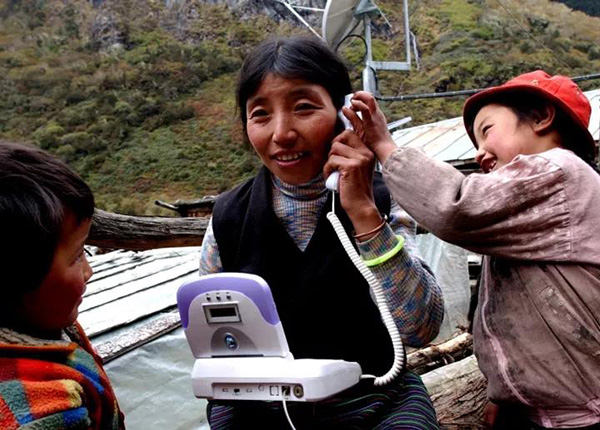 2003年10月,卓嘎與孩子們一起從家鄉給在山外的朋友打電話。