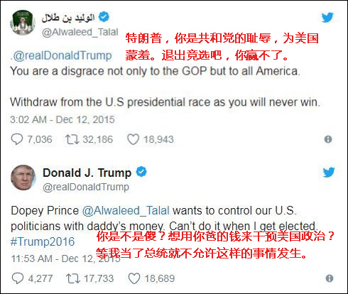 而他和特朗普的“恩怨情仇”還不止於此,據央視財經報道,早在1991年,瓦利德王子從特朗普手中買下一艘遊艇,特朗普當時負債9000萬美元;1995年他又從資金鍊緊張的特朗普手中買下紐約廣場酒店。2016年,瓦利德王子曾在推特上與特朗普互動,笑稱“我曾兩次解救過你,也許會有第三次?”