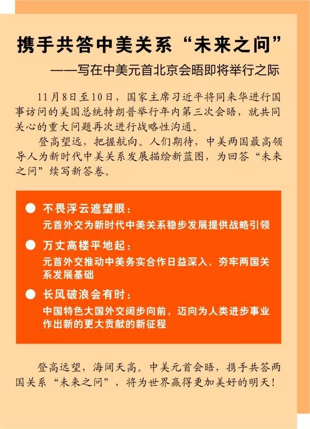 在特朗普到訪中國前,新華社刊登文章**《特朗普今起訪華,中美元首攜手共答兩國關係“未來之問”》**,展望了中美關係的未來。