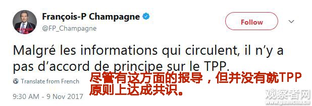 但加拿大國際貿易部長尚帕涅(Francois-Philippe Champagne)後來在推特上稱:“儘管有這方面的報導,但並沒有就TPP原則上達成共識。”