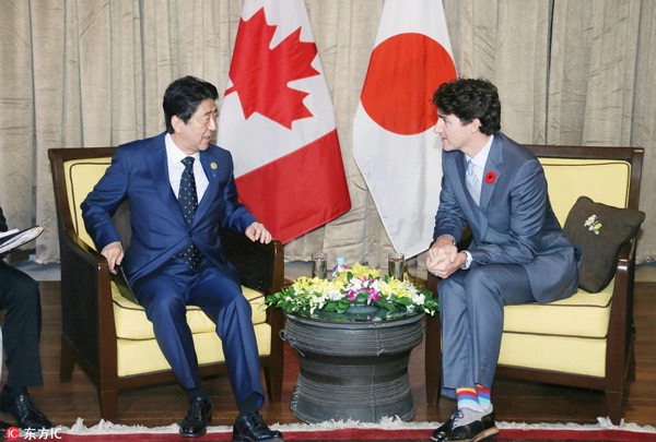 今天的安排,原計劃是加拿大總理特魯多與日本首相安倍會談,談妥以後11國領導人一起開會簽字。