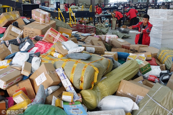 2017年11月9日,在安徽省阜陽市潁東開發區內的百世快遞阜陽分公司內,快遞分揀人員正忙碌分揀堆如“小山”的進出港快件。(圖片來源:視覺中國)
