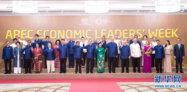 新華國際頭條微信公號12日消息,10日晚,出席APEC峴港會議的亞太經合組織各成員領導人,身着越南傳統絲質襯衫,拍攝“全家福”。