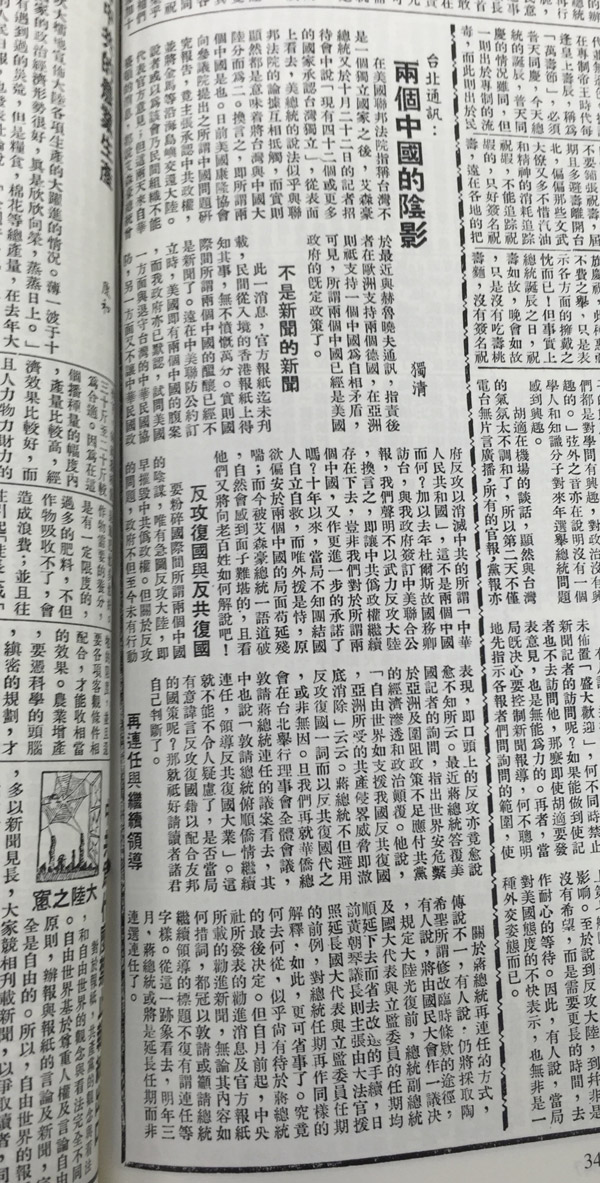 1959年,蔣介石此前一直掛在口邊的“反攻復國”,因美國的對台政策而轉變為“反共復國”,一字之差,原本的積極轉為消極,被海外反共勢力痛罵自我矮化,併為美國的“兩個中國”政策背書,儘管他從未公開承認“兩個中國”,始終堅持“一中”。