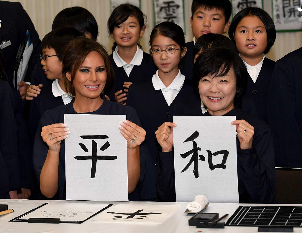 而此次特朗普訪日期間,安倍昭惠也邀梅拉尼婭一同外出,包括在東京銀座逛商場,參觀當地小學等。值得一提的是,兩人還動手書寫漢字書法,安倍昭惠寫下“和”字,梅拉尼婭寫出“-平”字,合起來便是“和平”。