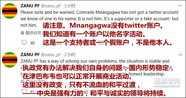 從當地時間14日晚開始,一個自稱是“非洲民族聯盟——愛國陣線(ZANU PF)”(即津巴布韋執政黨)的賬號開始頻繁發聲,並引起媒體廣泛引述。