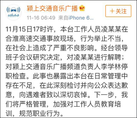 16日早晨6時許,潁上交通音樂廣播官方微博證實了凌某某的身份,並表示已經對其進行解聘,相關頻道負責人也被停職檢查。