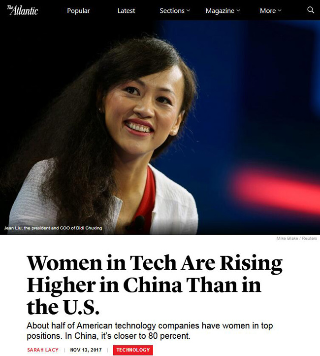 美國《大西洋月刊》11月13日刊文《中國女性在科技領域的地位高過美國》