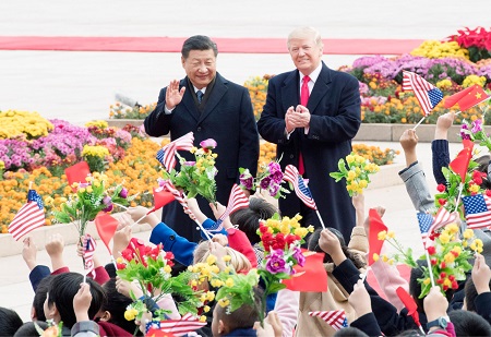 11月9日,國家主席習近平在北京人民大會堂東門外廣場舉行歡迎儀式,歡迎美利堅合眾國總統唐納德·特朗普對中國進行國事訪問