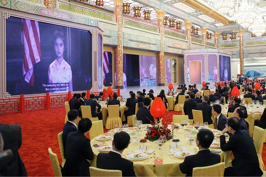 11月9日,北京,人民大會堂舉行晚宴歡迎美國總統特朗普訪華,大屏幕上播放着特朗普外孫女唱中文歌的視頻